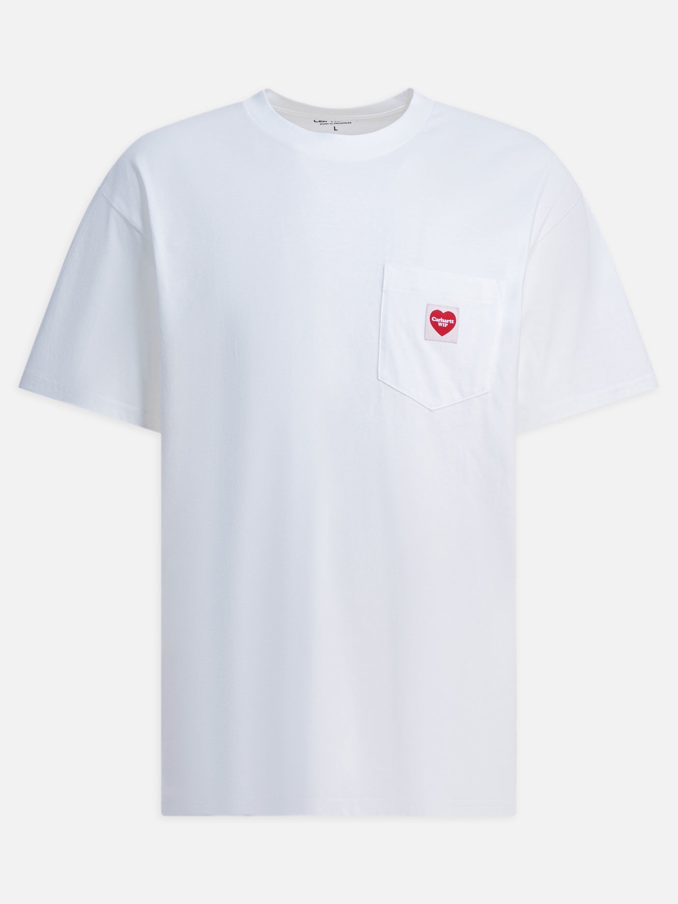 Carhartt WIP "S/S Pocket Heart" T-shirt made of lightweight organic cotton jersey with a loose silhouette and short-sleeved construction. The garment features an embroidered heart-shaped applique insert on the front, offering a compact fabric construction and smooth surfaces. Linear seams and a finish devoid of additional decorative elements define the T-shirt's essential profile.