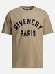 "Givenchy Paris" Givenchy T-shirt in cotton with a linear structure, constructed outerwear with short sleeves. The crew neck features a riveted workmanship, while the front houses the Givenchy Paris grosgrain appliqué, attached by embroidered zig-zag stitching, which defines a structural detail on the surface. The silhouette is regular, with no additional decorative elements, keeping the construction focused on material essentiality and workmanship of the inserts.