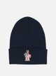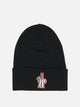 Moncler Grenoble wool cap, made of extra fine rib-knit wool yarn, featuring a medium-weight construction that provides thermal insulation and protection. The fitted silhouette conforms to the shape of the head, offering stable fit. The construction with no visible seams ensures comfort against the skin. A logo applique identifies the model on the outside.