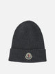 Moncler wool cap, made of extra fine wool yarn with ribbed knitting. The construction features a fitted silhouette and structured lapels. The cap is finished with an applied Moncler logo patch placed frontally on the lapel. Fineness 7 ensures compactness and regularity of the knit. Workmanship and materials enhance the linear and essential structure of the model.