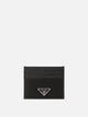 Prada's Re-Nylon "Speedrock" card case with compact recycled technical fabric construction. The model features rectangular silhouette, flat construction and finished profiles. The front features a visible applied enameled metal triangle logo. Six card slots distributed on both sides, a central interior pocket and moiré and leather lining complete the functional composition and durability of the accessory.