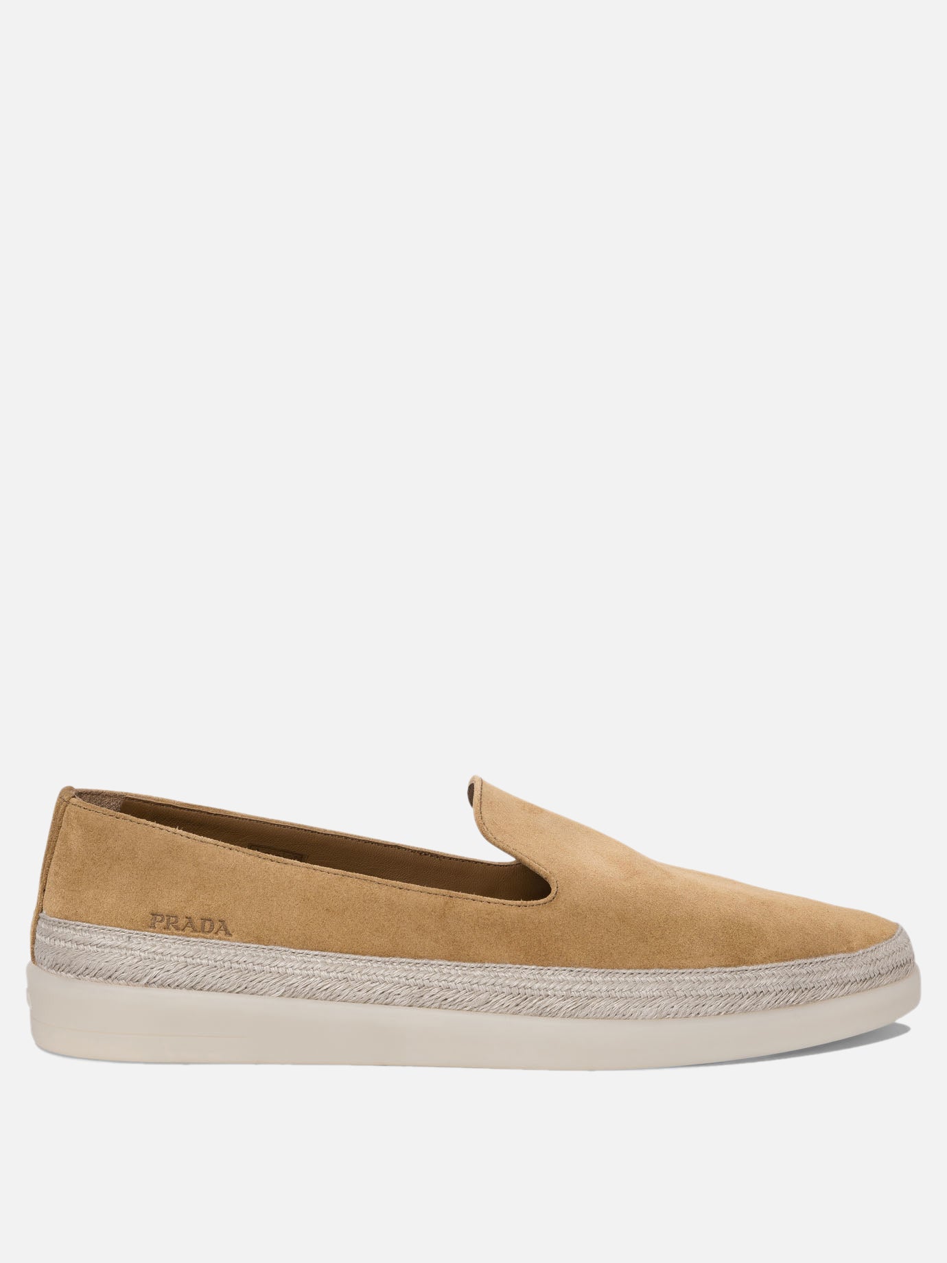 Discover Prada's signature suede espadrilles, perfect for the man who wants to combine comfort and style in a versatile shoe. These espadrilles are designed to evoke a sense of lightness, with an informal design enhanced by thoughtful details, ideal for a casual and sophisticated look.