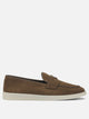 Prada suede loafers made with suede upper and leather lining. The construction features a pinch-stitched tray that defines the upper structure. The silhouette is linear with a low profile. The front detail includes enameled metal triangle logo applied on a strap. The sole is made of lightweight rubber, while the removable footbed is covered in leather.