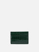 Tom Ford "Exotic Line" card case made of leather with crocodile print and glossy finish. Slim, compact structure features hard surfaces and sharp edges. Construction uses leather cuts juxtaposed with minimal stitching. The Tom Ford logo is embossed on the front. Interior trim includes parallel compartments designed for credit cards or business cards.