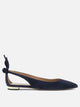 Aquazzura's "Bow Tie Ballet" ballet shoes, constructed with soft-surfaced velvet upper and matte finish. The structure features a sleek silhouette and side cut-out details. The heel is finished with a flat bow and the base integrates a metallic heel. The interior showcases a leather lining and padded footbed, while the leather sole is personalized with a gold-plated Ananas logo.