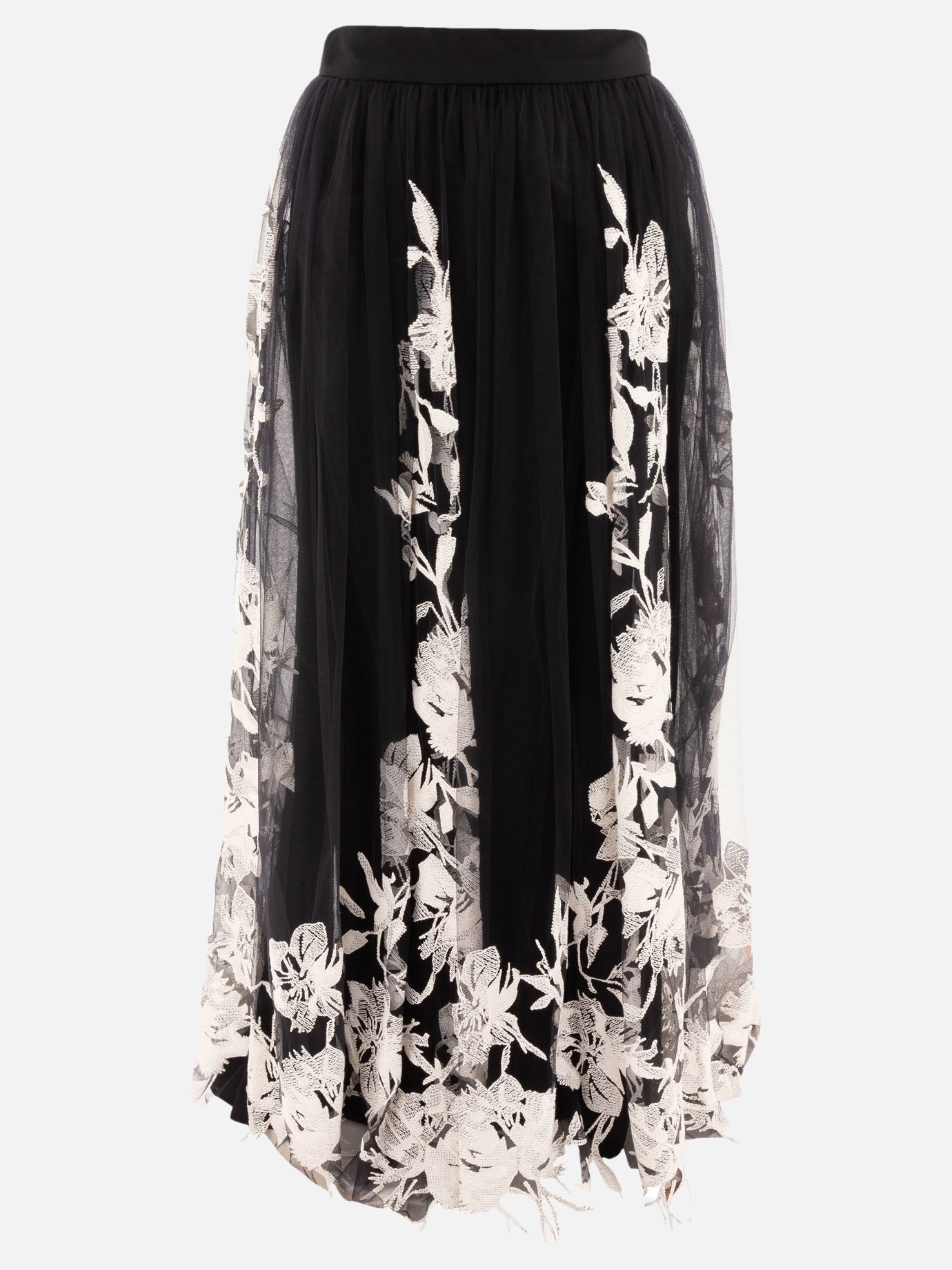 The embroidered tulle skirt by Elie Saab is a masterpiece of elegance and femininity. This garment combines a trapeze structure with contrasting embroidery that adds a touch of sophistication. Perfect for those who love to stand out with a refined and timeless style, this skirt is ideal for special occasions and glamorous evenings.