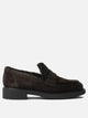 Gianvito Rossi "Harris" loafers made of suede leather with rounded silhouette construction. Model features the traditional front penny bar. The construction features a suede upper, fur-trimmed interior and a tonal rubber sole with a low profile and essential lines. Finishing details finished via fine stitching.