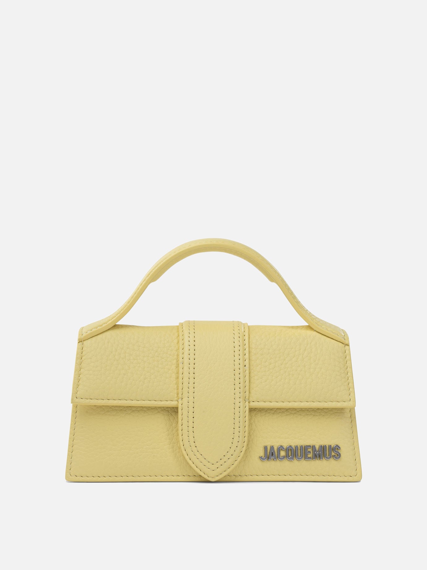 Jacquemus "Il Bambino" handbag, made of grained leather with rigid structure and compact silhouette. The model features a padded top handle, magnetic front flap closure and dyed edge. A flat back pocket is attached to the exterior; visible topstitching defines the profiles. Every metal element, including trim and engraved logo, is silver-plated.