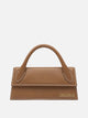 Jacquemus "Le Chiquito" handbag, constructed of smooth leather with a rigid structure. The model is distinguished by an elongated silhouette with a reinforced handle that provides stability to the grip. It features a magnetic flap closure and an adjustable, removable shoulder strap attached via an engraved lobster clasp. Gold metallic elements, including trim and logo, complement the fully cotton-lined structure. Trim-dyed edges.