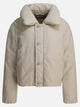 Lemaire down-filled down jacket made from a linen and cotton blend fabric with water-repellent treatment. The construction features a straight-cut silhouette, cinched at the waist, with inner lining and quilting. The garment features a scoop neck with chin strap, combined zipper and button front closure, long sleeves and elastic cuffs.