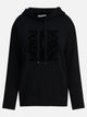 Max Mara virgin wool hooded sweater made from pure wool interlock yarn. The construction features an oversized volume silhouette with long dropped-shoulder sleeves. The hood is adjustable via drawstring. The bottom hem and cuffs are finished with ribbed trim. The front features MaxMaragram embroidery done with a brush technique.