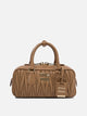 Miu Miu "Arcadie" handbag made of leather with light padding that defines a compact and voluminous structure. The silhouette recalls the classic bowling bag, with two leather handles and a removable and adjustable shoulder strap. Painted metal front lettering logo is integrated as a functional and decorative element, while gold hardware completes the construction. Top zipper closure, support feet and cotton satin interior with zipper pocket.