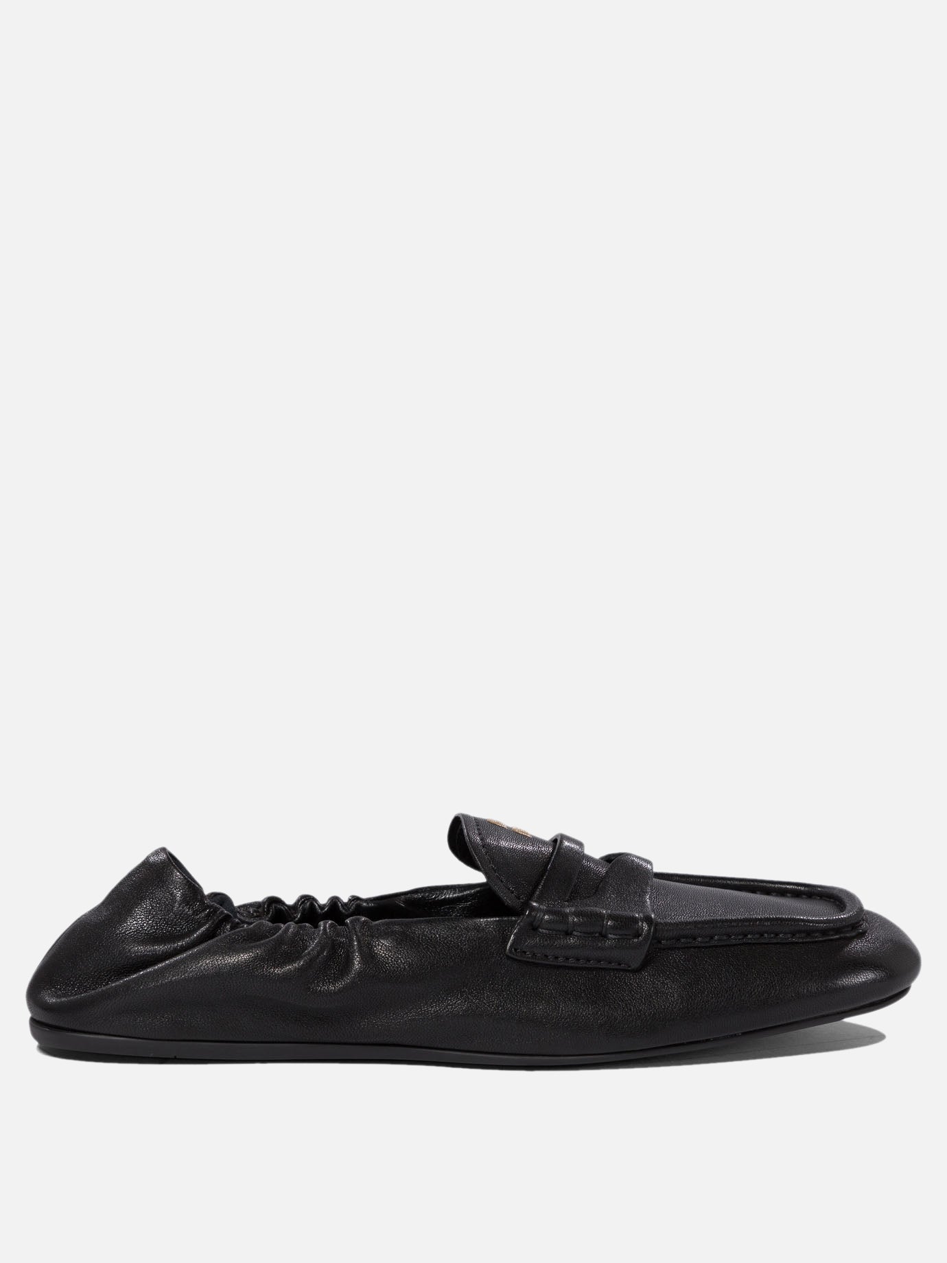 Miu Miu's "Ruches" loafers embody a style that is a perfect combination of elegance and practicality. These shoes, designed for the modern woman, feature nappa leather workmanship with a refined gold embossed logo, adding a touch of luxury to any outfit.