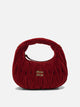 Miu Miu matelassé velvet "Wander" handbag, made in a mini version with a three-dimensional effect matelassé workmanship. The compact structure features a hobo silhouette with a curved profile and a soft body enlivened by the geometric texture. The adjustable leather shoulder strap also allows it to be worn over the shoulder. Metal lettering logo is applied on the front, while the top closure is zipped.