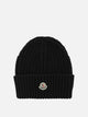 Moncler wool beanie, made of ribbed knit with a flexible, contoured construction, features a fitted silhouette that conforms to the shape of the head. The turned-up hem provides added thickness and texture at the front. The presence of an applied logo patch on the front adds a distinctive element to the essential design. The use of natural yarns emphasizes the minimalist construction and tactile appearance of the product.