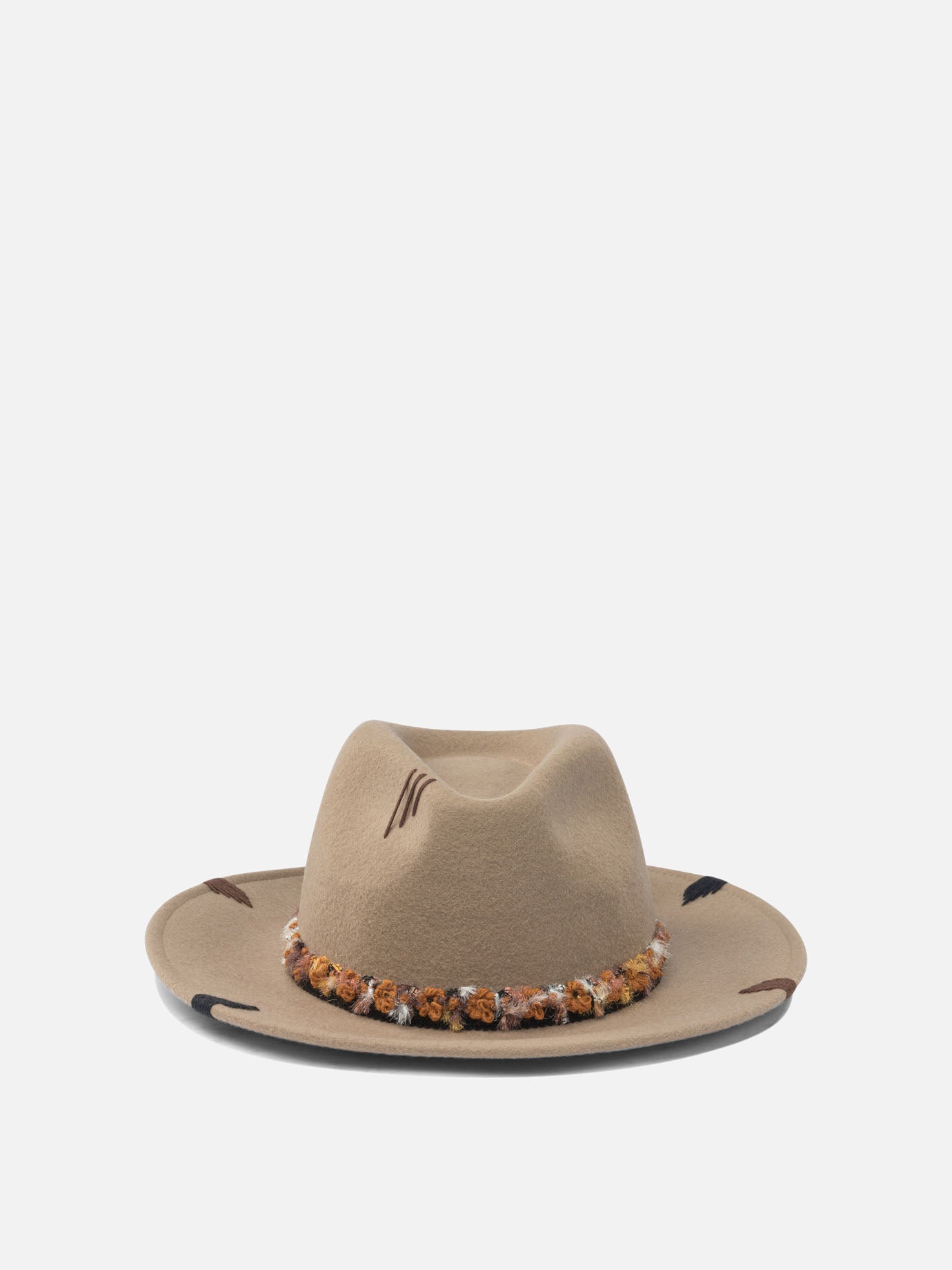 "Positive Mind" hat The Hat Gang. Classic structure with a medium brim, profiled along measured geometric lines. Handmade according to traditional techniques, it features a rigid silhouette and a compact surface, characterized by decorative machine-embroidered motifs and the inscription "Positive Mind" positioned on the front. Workmanship and assembly performed with attention to textural details, with emphasis on quality of finish.